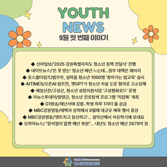 | 제목 | [YOUTHNEWS]유스뉴스 9월 첫 번째 소식 | ||||