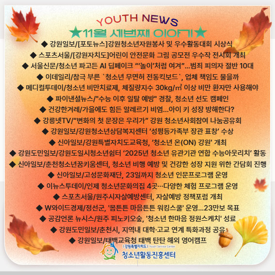 | 제목 | ★11월 세 번째 Youth News★ | ||||