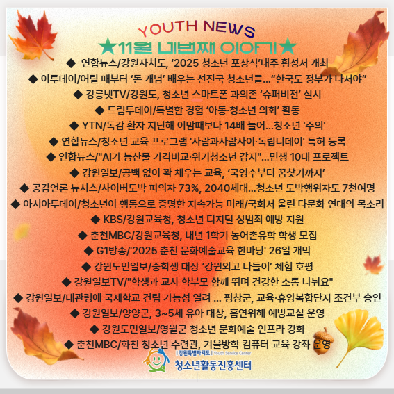 | 제목 | ★11월 네 번째 Youth News★ | ||||