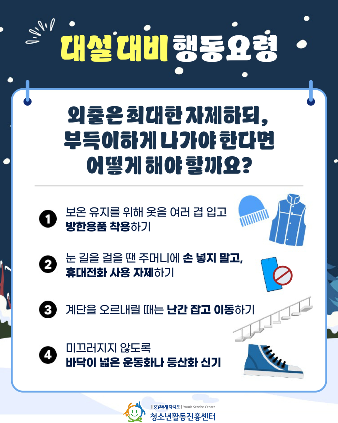 눈길 보행 시 주머니 손 빼고, 휴대전화 사용 자제