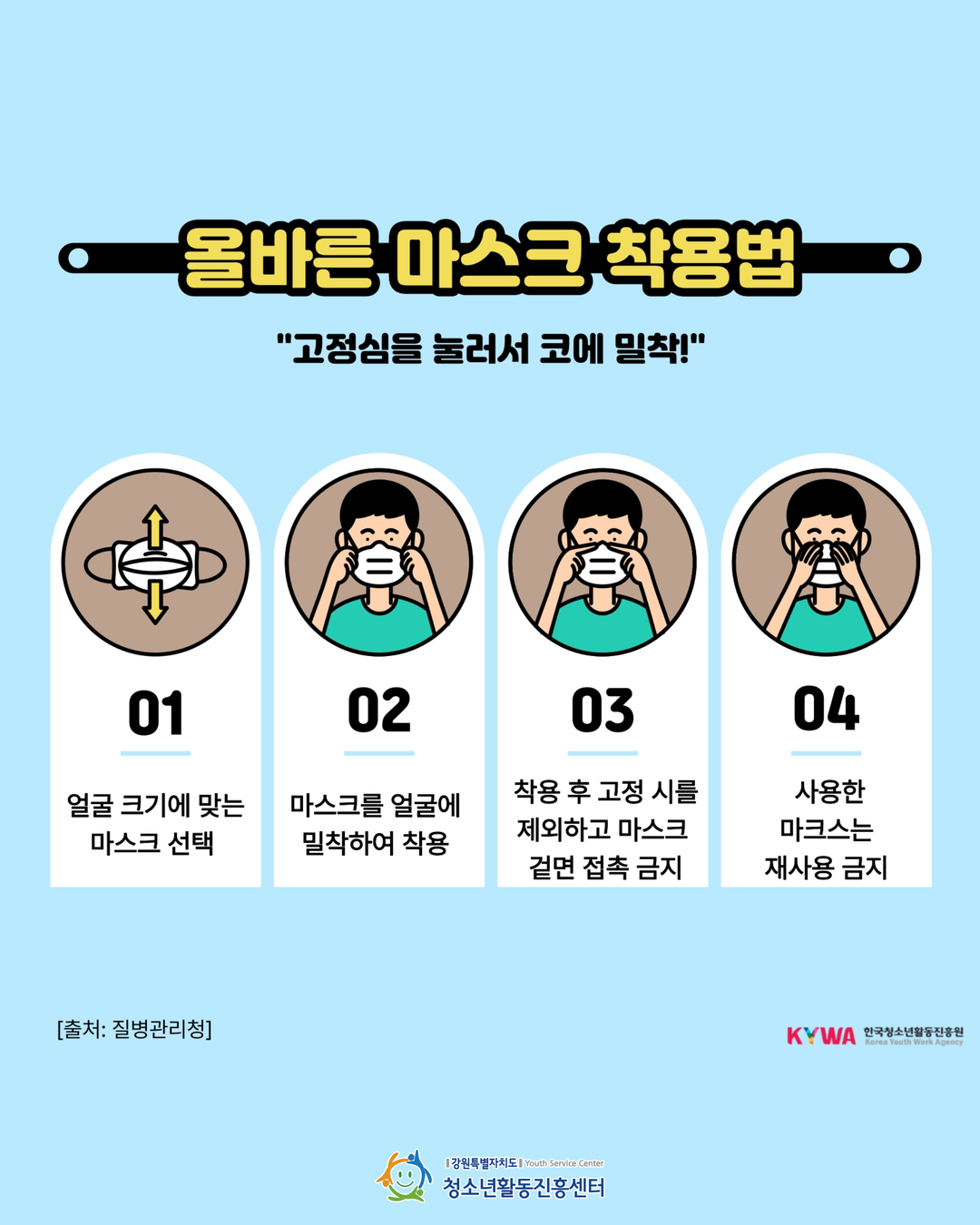 외출 시: 내 얼굴 크기에 맞는 마스크를 코에 밀착해서 착용하기!