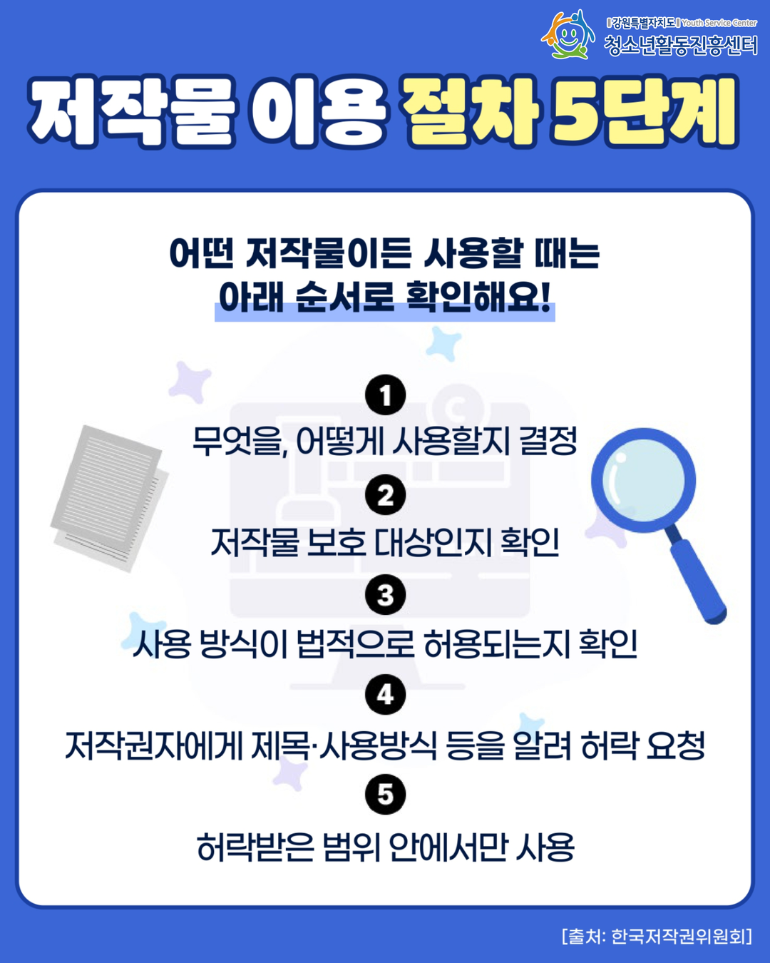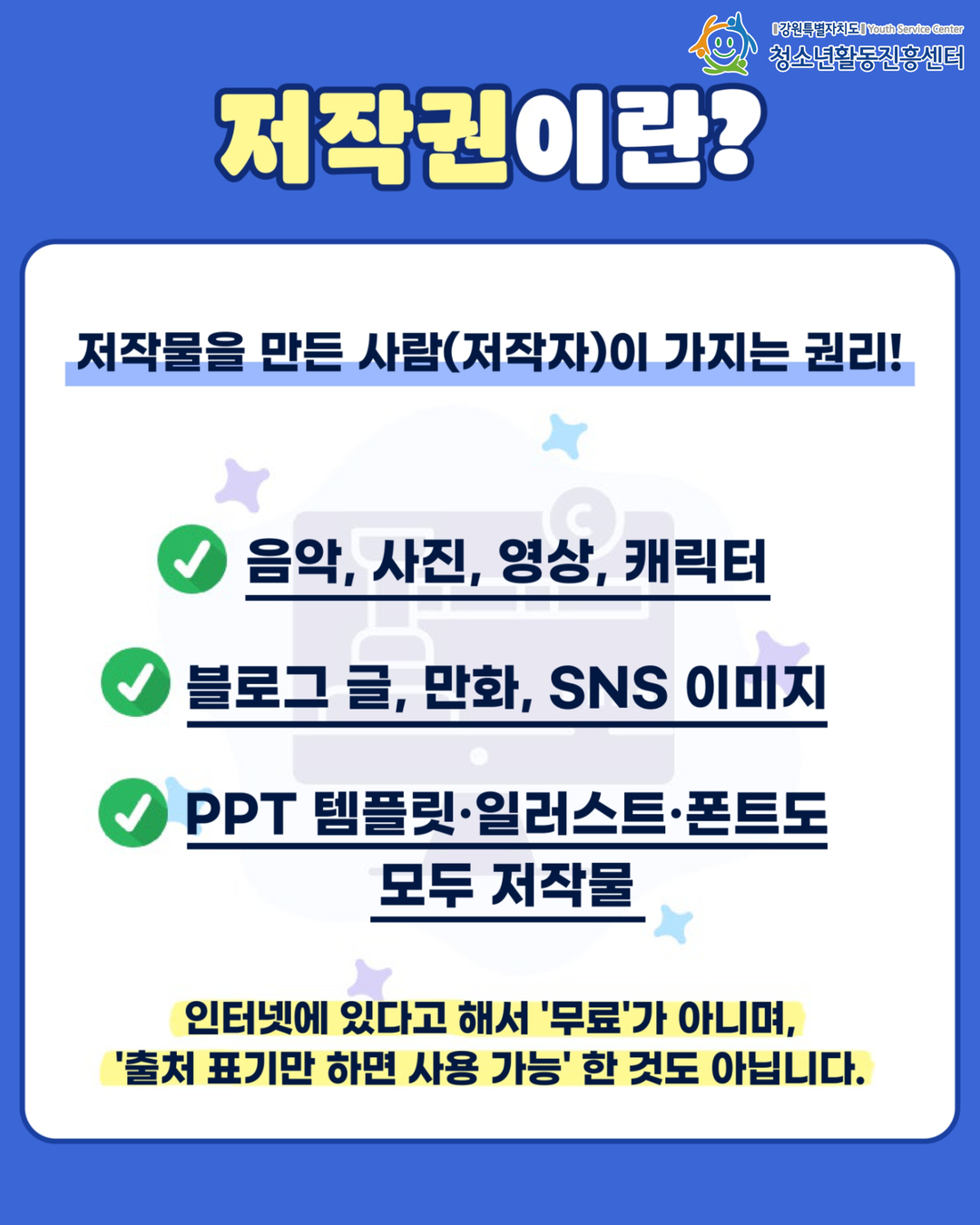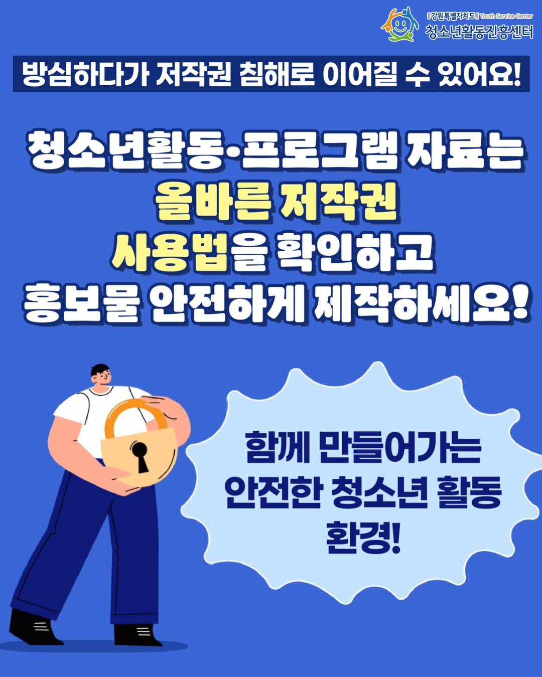 | 제목 | [안전해주세요] 올바른 저작권 확인, 안전한 청소년 활동의 시작입니다! | ||||