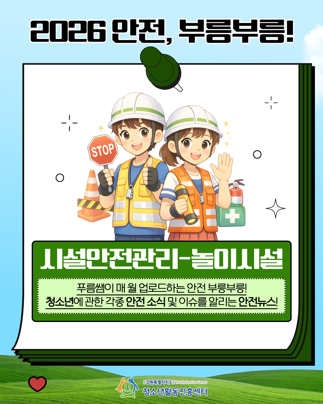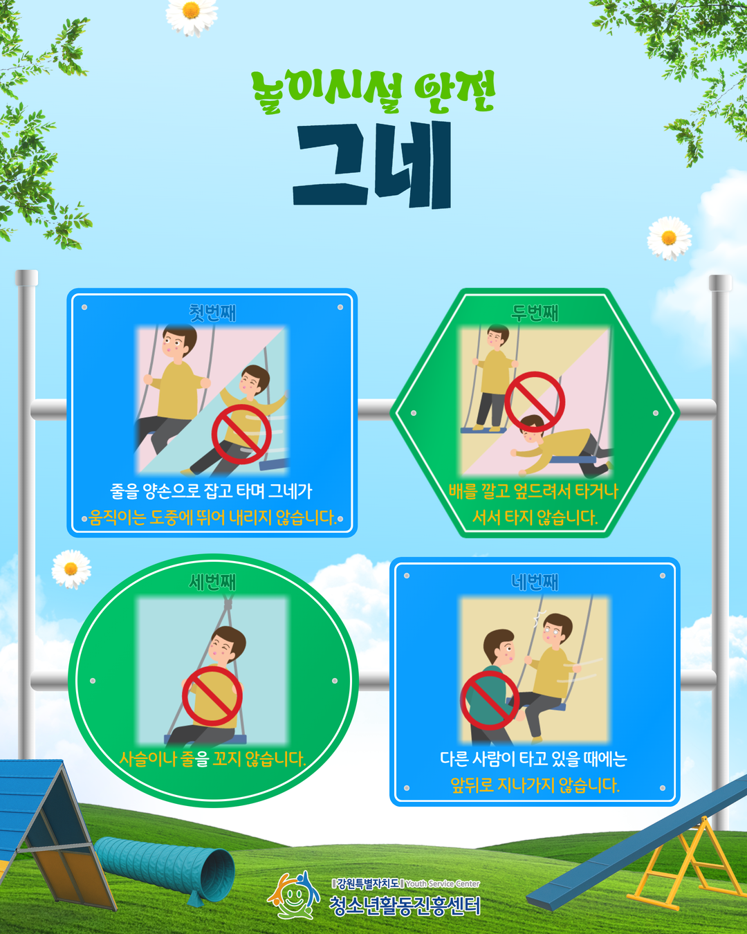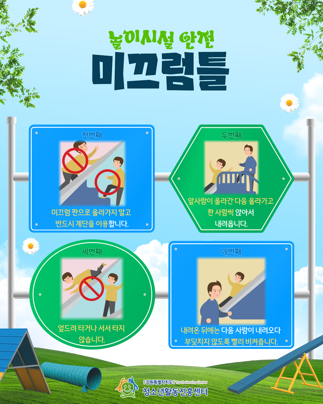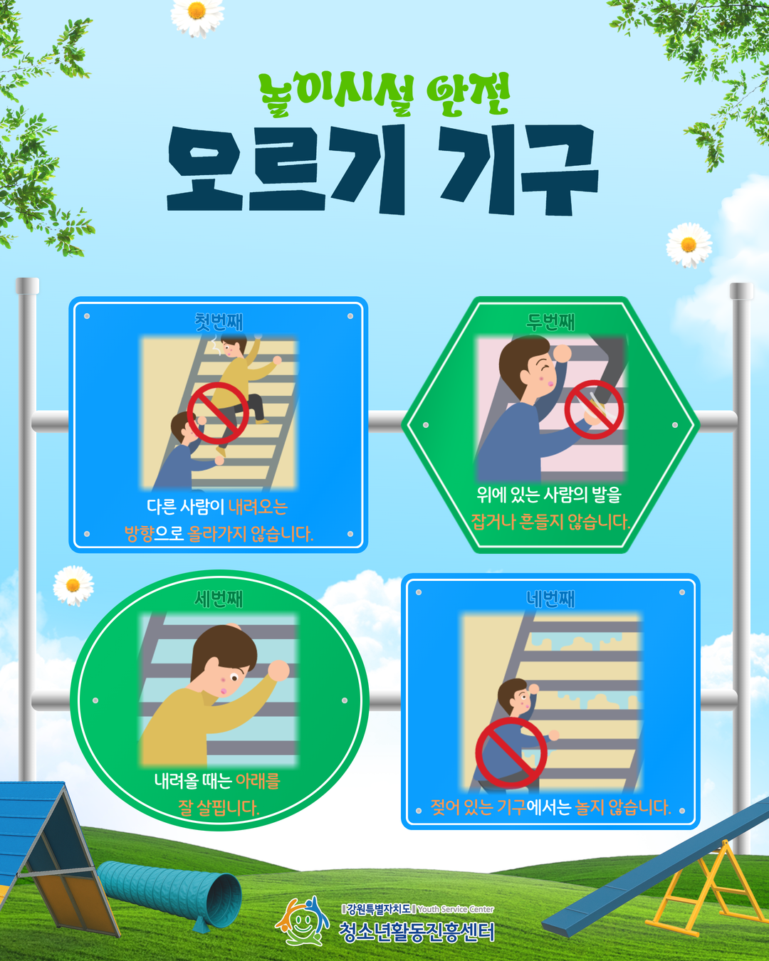 지속가능(SDGs)한 청소년활동, 강원을 물들이다.안녕하세요! 강원특별자치도청소년활동진흥센터입니다😊🌿따뜻한 봄, 야외활동이 많아지는 4월!즐거운 놀이도 안전수칙을 지킬 때 더 즐겁습니다.미끄럼틀, 그네, 오르기 기구 등🛝놀이시설 이용 시 꼭 알아야 할 안전수칙을 담았습니다.우리 모두 함께 확인하고💚안전한 활동 문화를 함께 만들어 주세요💚