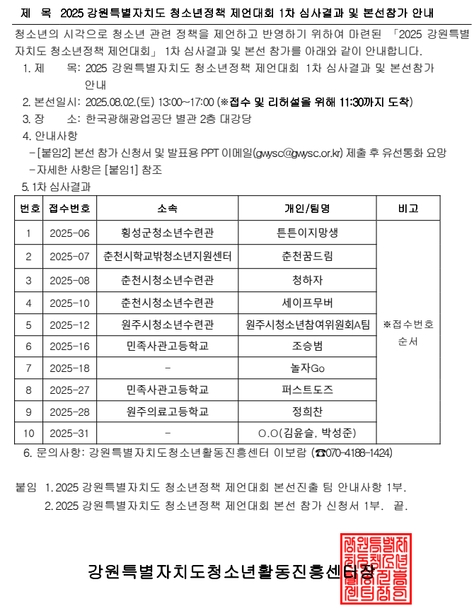 [붙임1]2025 강원특별자치도 청소년정책 제언대회 본선진출 팀 안내사항.hwp