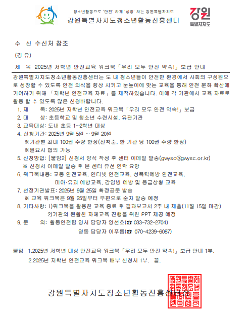 [공문]2025년 저학년 안전교육 워크북 '우리 모두 안전 약속' 보급 안내.pdf