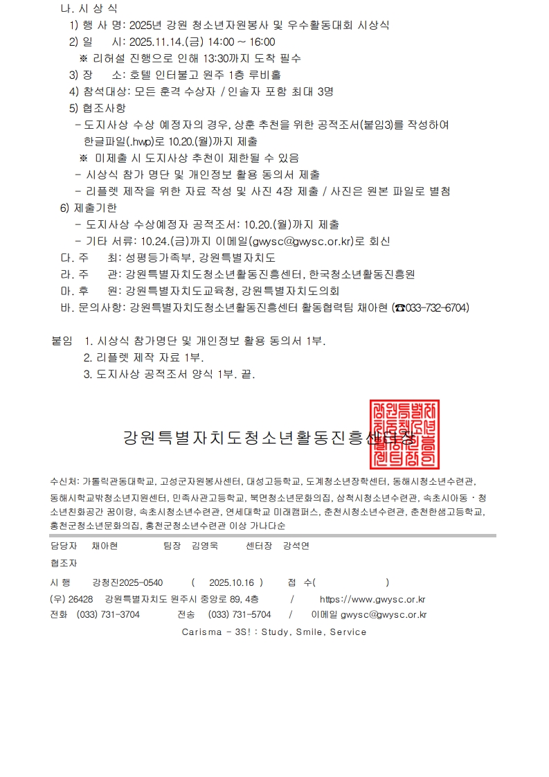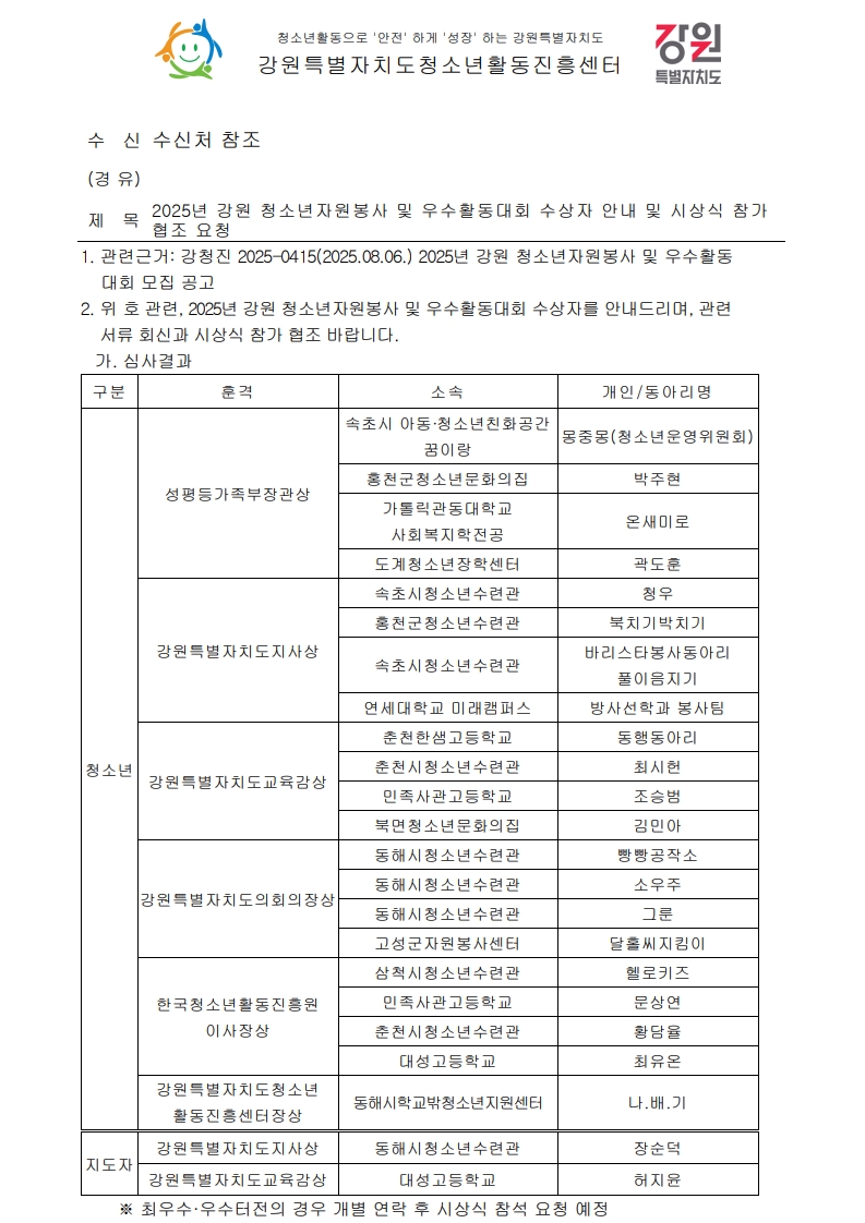 2025년 강원 청소년자원봉사 및 우수활동대회 수상자 안내 및 시상식 참가 협조 요청