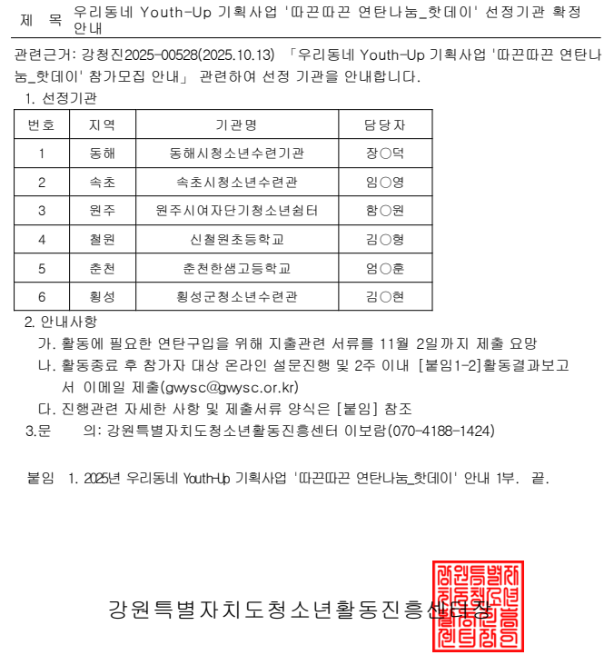 제목 우리동네 Youth-Up 기획사업 '따끈따끈 연탄나눔_핫데이' 선정기관 확정 안내