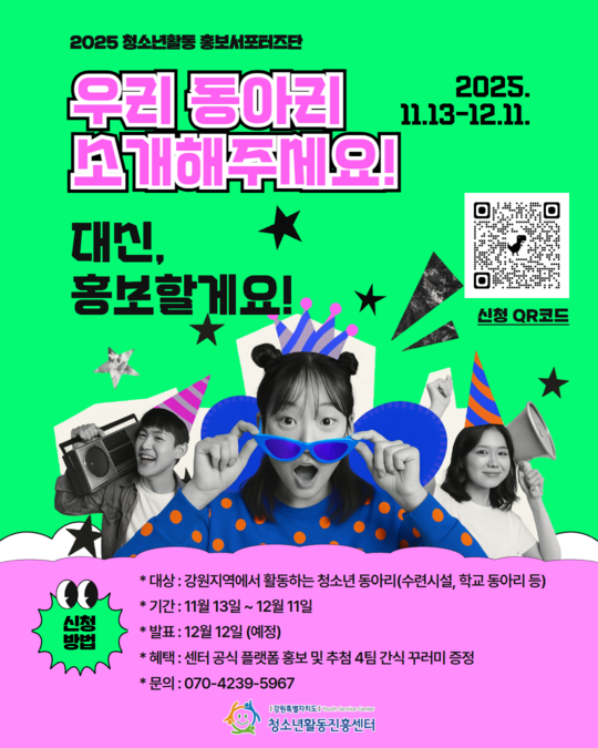 | 제목 | 2025 청소년활동 홍보서포터즈단 "우리 동아리 소개해주세요" 이벤트 | ||||