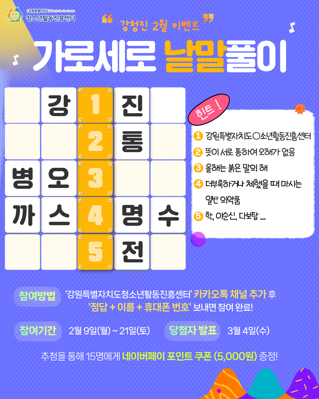 | 제목 | 강청진 2월 이벤트 - 도전! 가로세로 '낱말풀이' | ||||