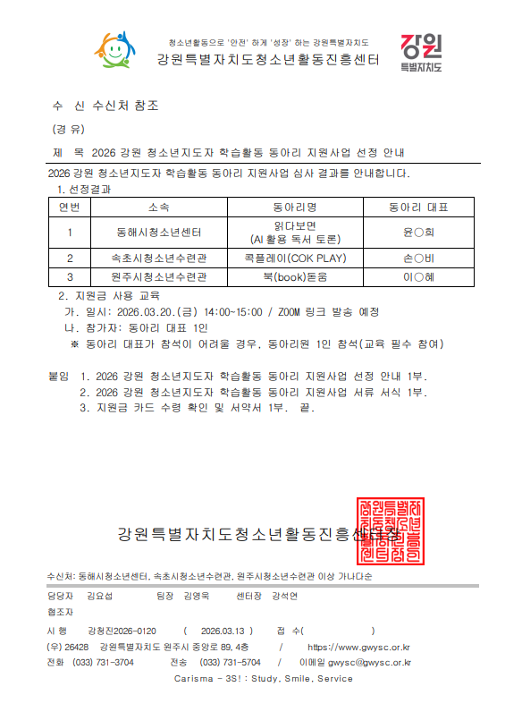 2026 강원 청소년지도자 학습활동 동아리 지원사업 선정 안내