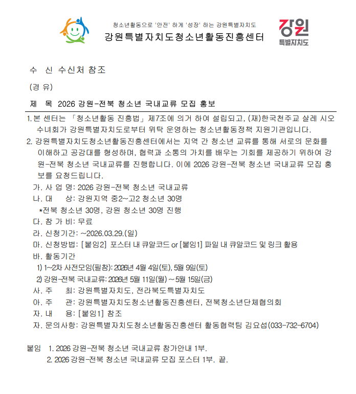 | 제목 | 2026 강원 전북 청소년 국내교류 모집 | ||||