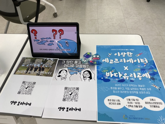 이번 기획활동은 강릉시중앙청소년문화의집에서 진행했으며, 지역 청소년들을 대상으로 환경 영상을 시청 및 바다유리공예활동을 하는시간을 가졌습니다. 청소년들은 영상을 통해 해양 환경과 일상 속 환경 문제를 쉽게 공감할 수 있도록 메시지를 전달했습니다. 특히 영상 관람 이후에는 해변에서 수거된 바다유리를 재료로 한 공예 활동을 진행하여 환경 보호의 의미가 담긴 체험을 했습니다.